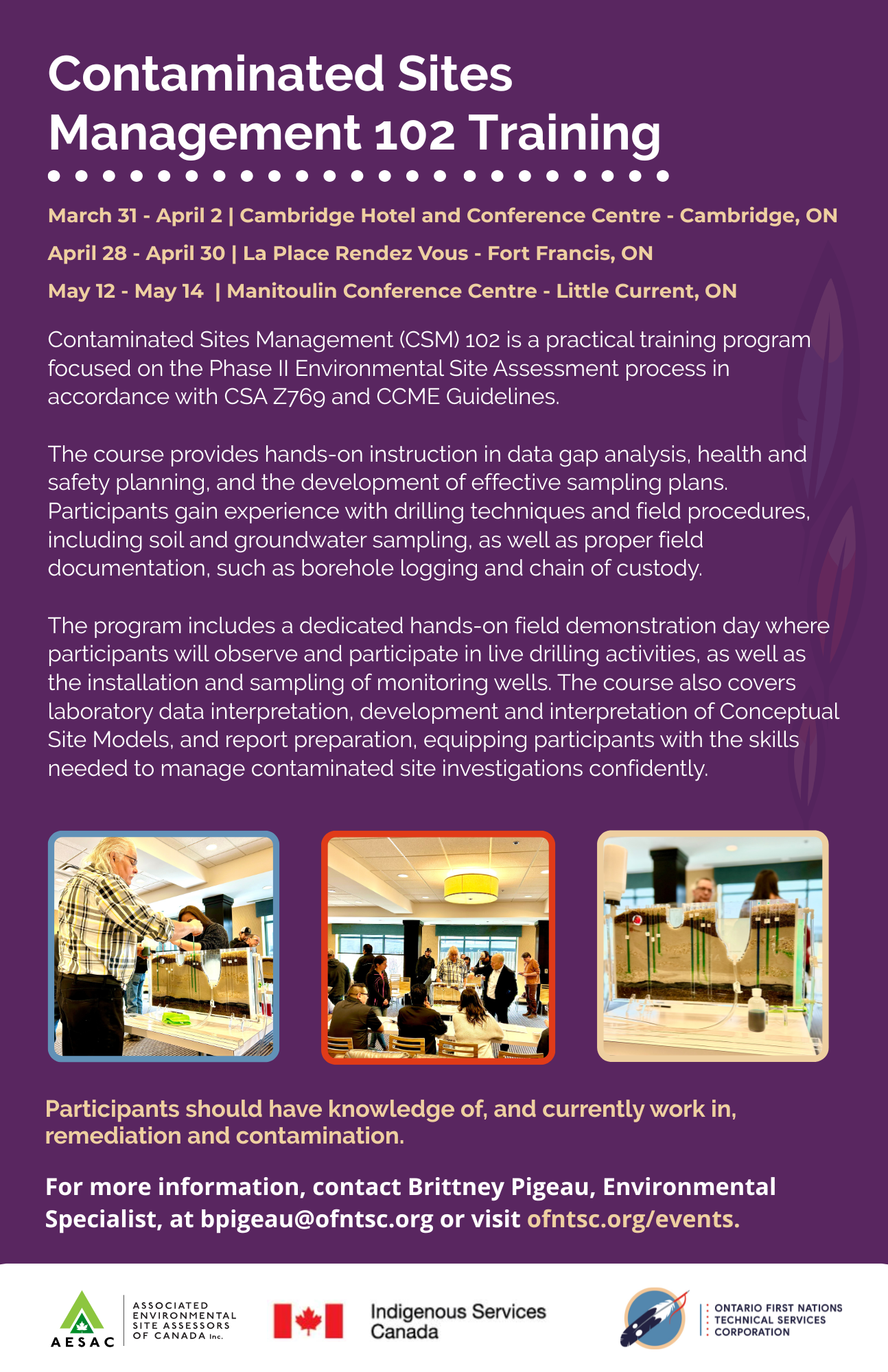 Contaminated Sites Management (CSM) 102 RegistrationCambridge, ON (March 31 - April 2) - RegisterFort Frances, ON (April 28-30) - Register Manitoulin - Little Current, ON (May 12-14) - Register Date and TimeMar 31st, 2026 - May 14th, 2026AddressONCanada